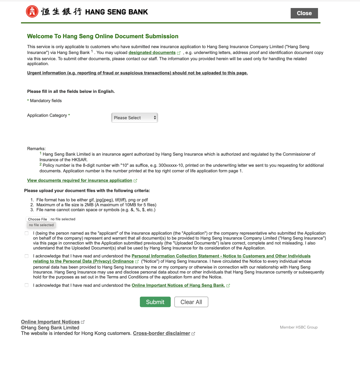 document upload journey from Hang Seng Bank (under HSBC Group)