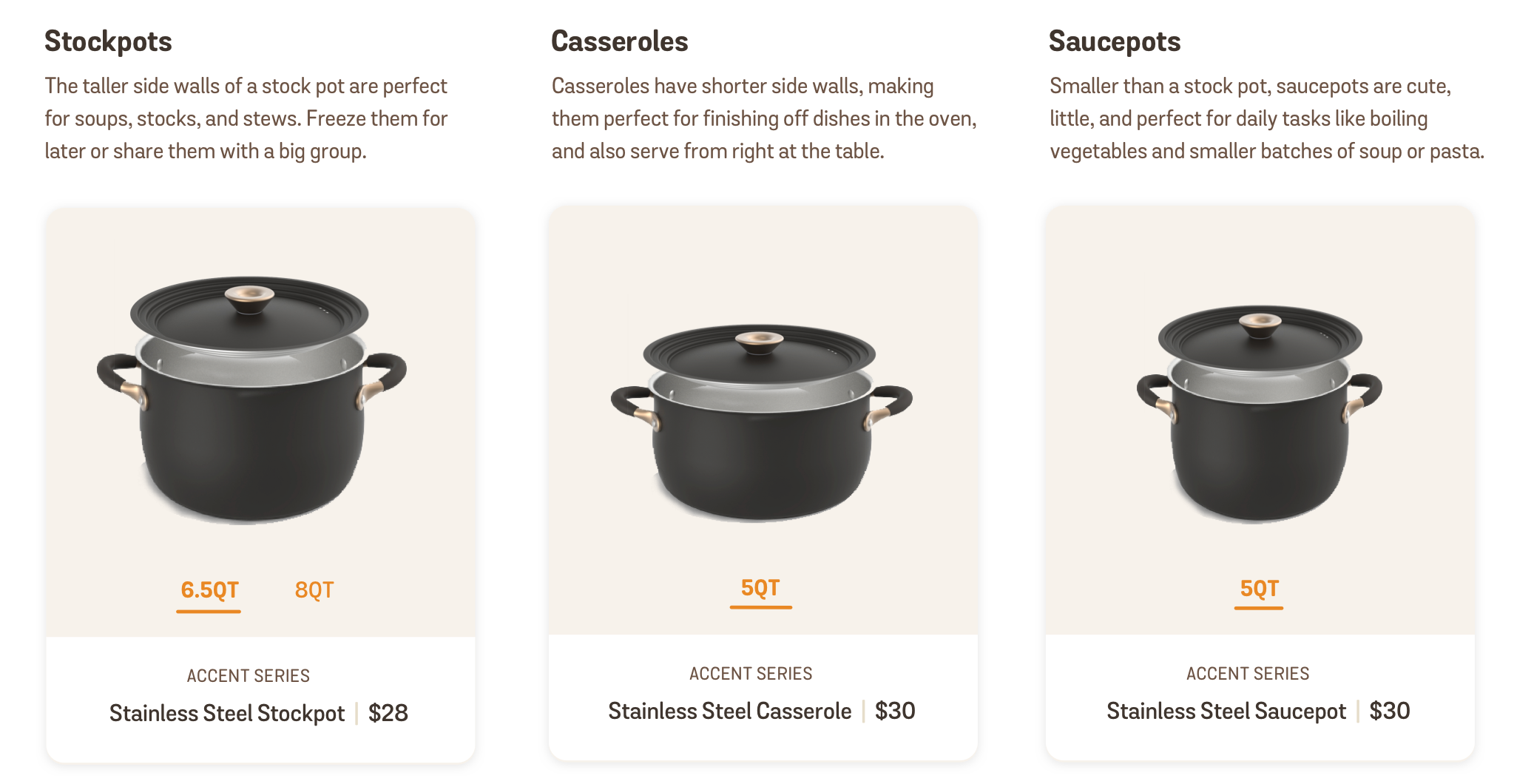 Most of them knew roughly what they needed (e.g. a pot), but they were not sure about the actual cookware type (e.g. stockpot or casserole) or size (e.g. 6qt or 7qt) or material (stainless steel or non-stick).