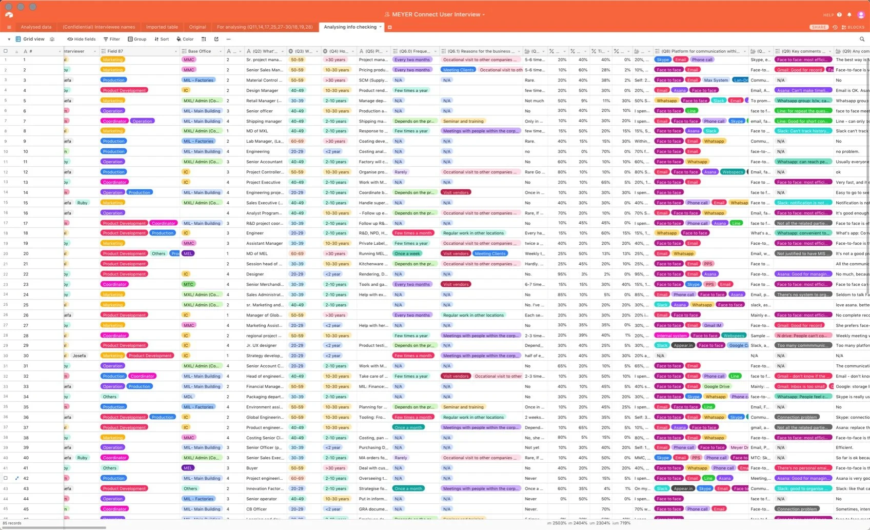 The team recorded data in typeform and later moved all the data into airtable. We combed and grouped information in different ways, trying to identify unique points or patterns that could lead to new opportunities.